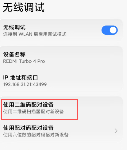 手机设置中打开【开发者选项】,点击【无线调试】,点击【使用二维码配对设备】