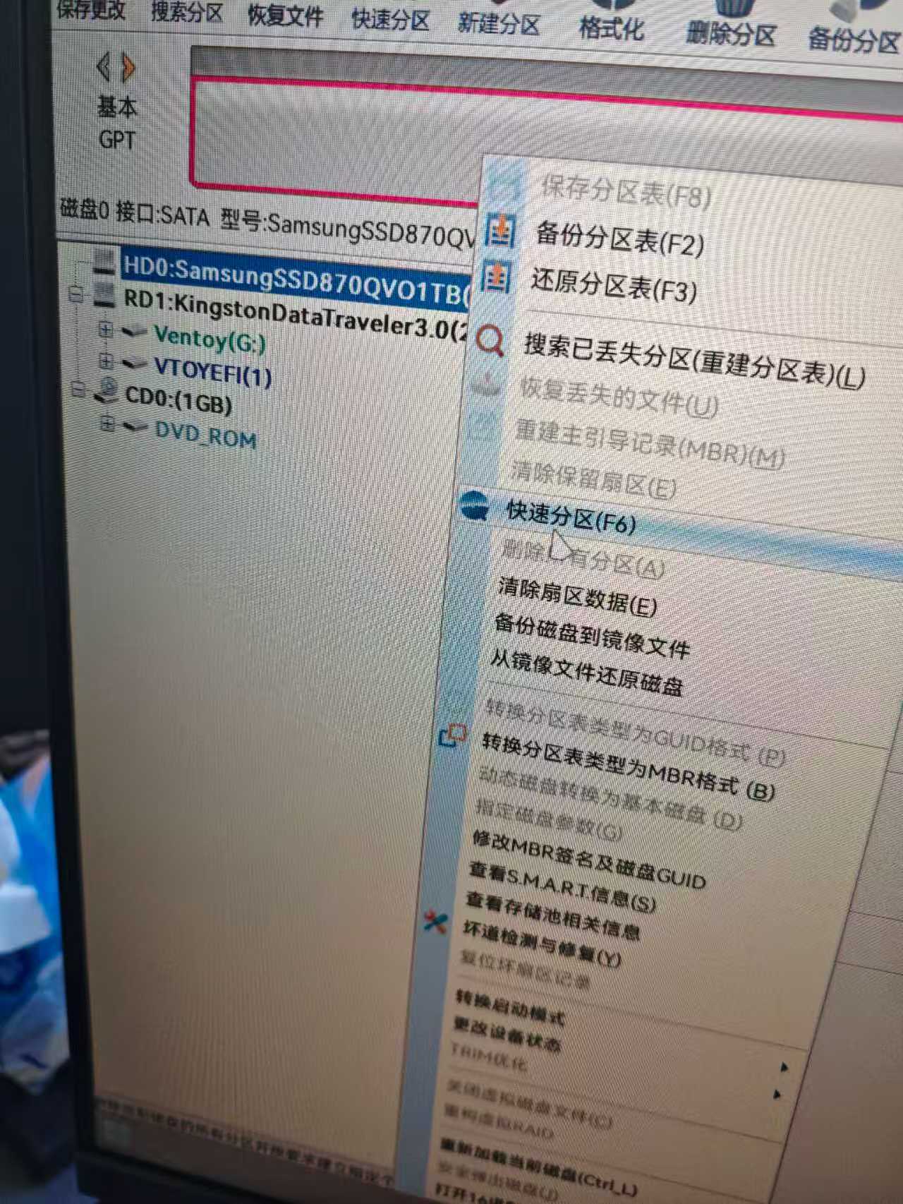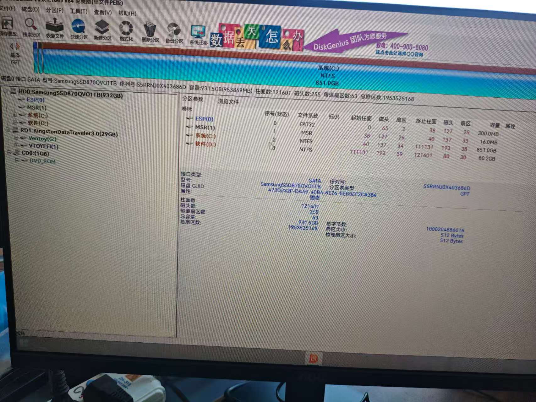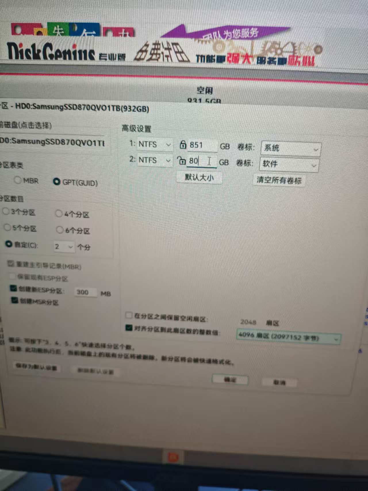 选GPT,分两个盘,一个系统盘,一个资料盘,右下角4k对齐,左下角勾选esp和msr分区,注意esp的盘符,这个是引导盘